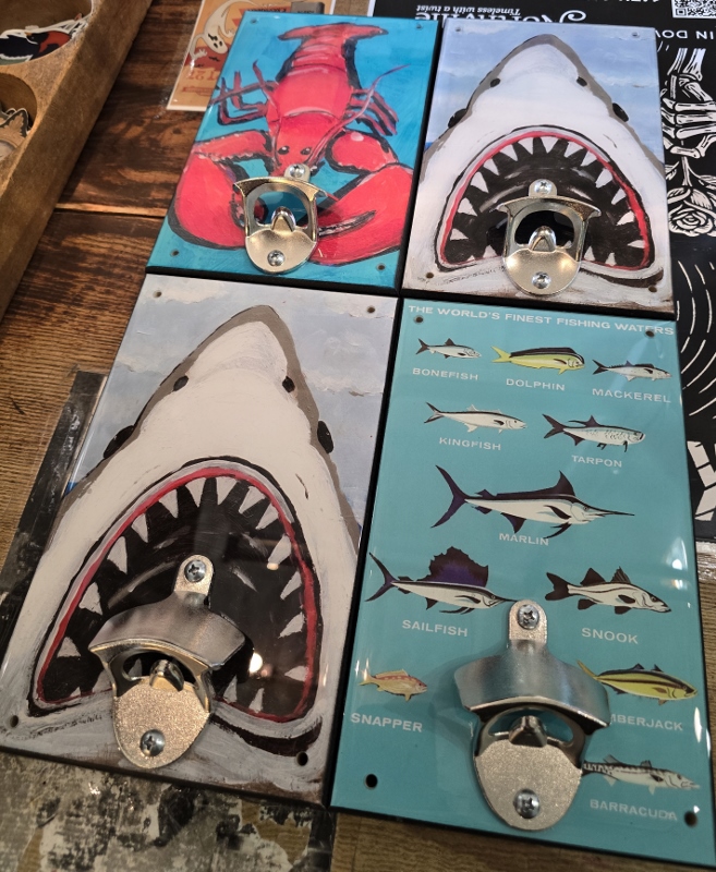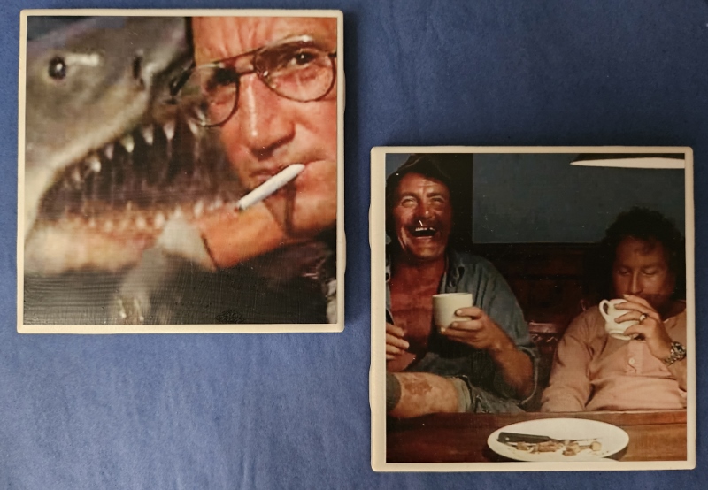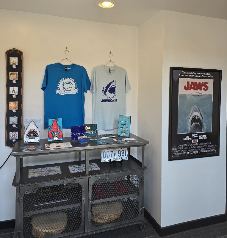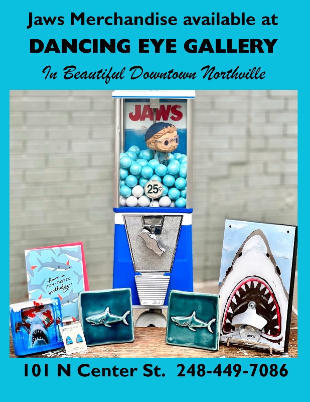 The Dancing Eye Gallery and the Tipping Point Theatre are collaborating on one of everyone’s favorite movies, Jaws, for it’s 50th anniversary. While the Tipping Point is now featuring a play called “The Shark is Broken” through Sunday, October 12, the Dancing Eye Gallery has created a Jaws vignette in the theatre lobby with some of our Jaws/shark merchandise. Shop the gallery for all things scary; sharks, and Halloween, too! Tickets for the play are still available. The perfect time to immerse yourself in Jaws!